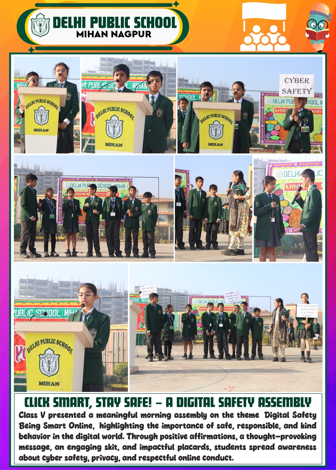 Class V presented a meaningful morning assembly on the theme “Digital Safety – Being Smart Online,” highlighting the importance of safe, responsible, and kind behavior in the digital world. Through positive affirmations, a thought-provoking message, an engaging skit, and impactful placards, students spread awareness about cyber safety, privacy, and respectful online conduct.