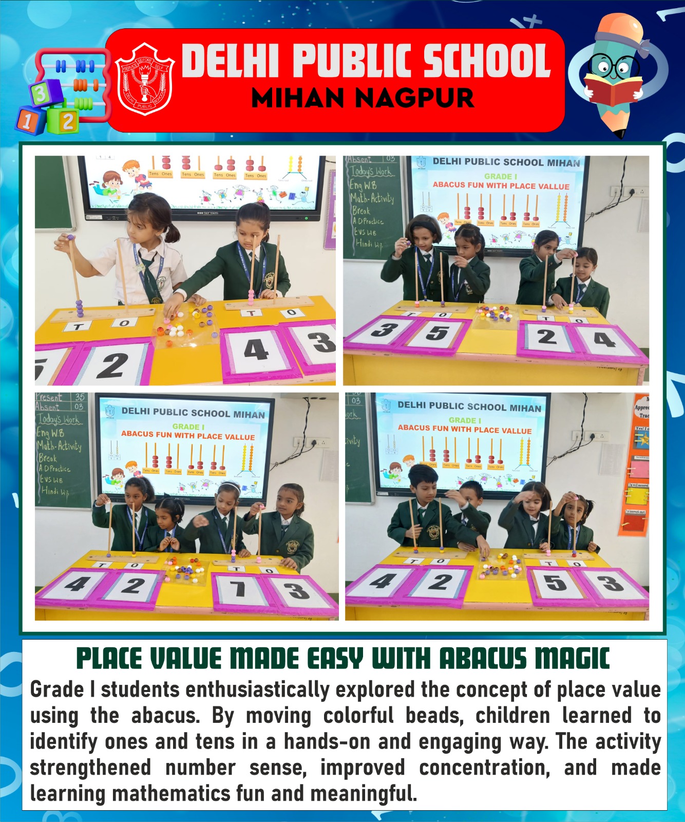 Grade I students enthusiastically explored the concept of place value using the abacus. By moving colorful beads, children learned to identify ones and tens in a hands-on and engaging way. The activity strengthened number sense, improved concentration, and made learning mathematics fun and meaningful.