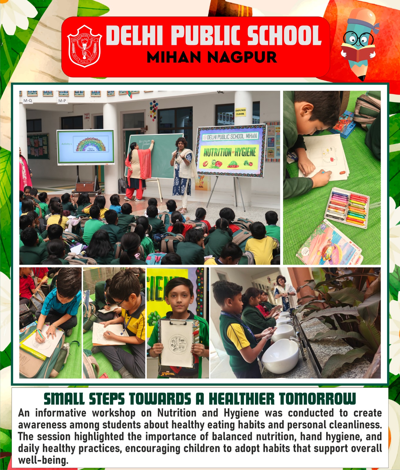 An informative workshop on Nutrition and Hygiene was conducted to create awareness among students about healthy eating habits and personal cleanliness. The session highlighted the importance of balanced nutrition, hand hygiene, and daily healthy practices, encouraging children to adopt habits that support overall well-being.