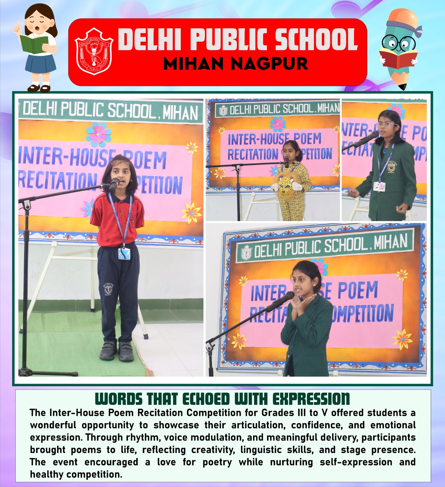 The Inter-House Poem Recitation Competition for Grades III to V offered students a wonderful opportunity to showcase their articulation, confidence, and emotional expression. Through rhythm, voice modulation, and meaningful delivery, participants brought poems to life, reflecting creativity, linguistic skills, and stage presence. The event encouraged a love for poetry while nurturing self-expression and healthy competition.
