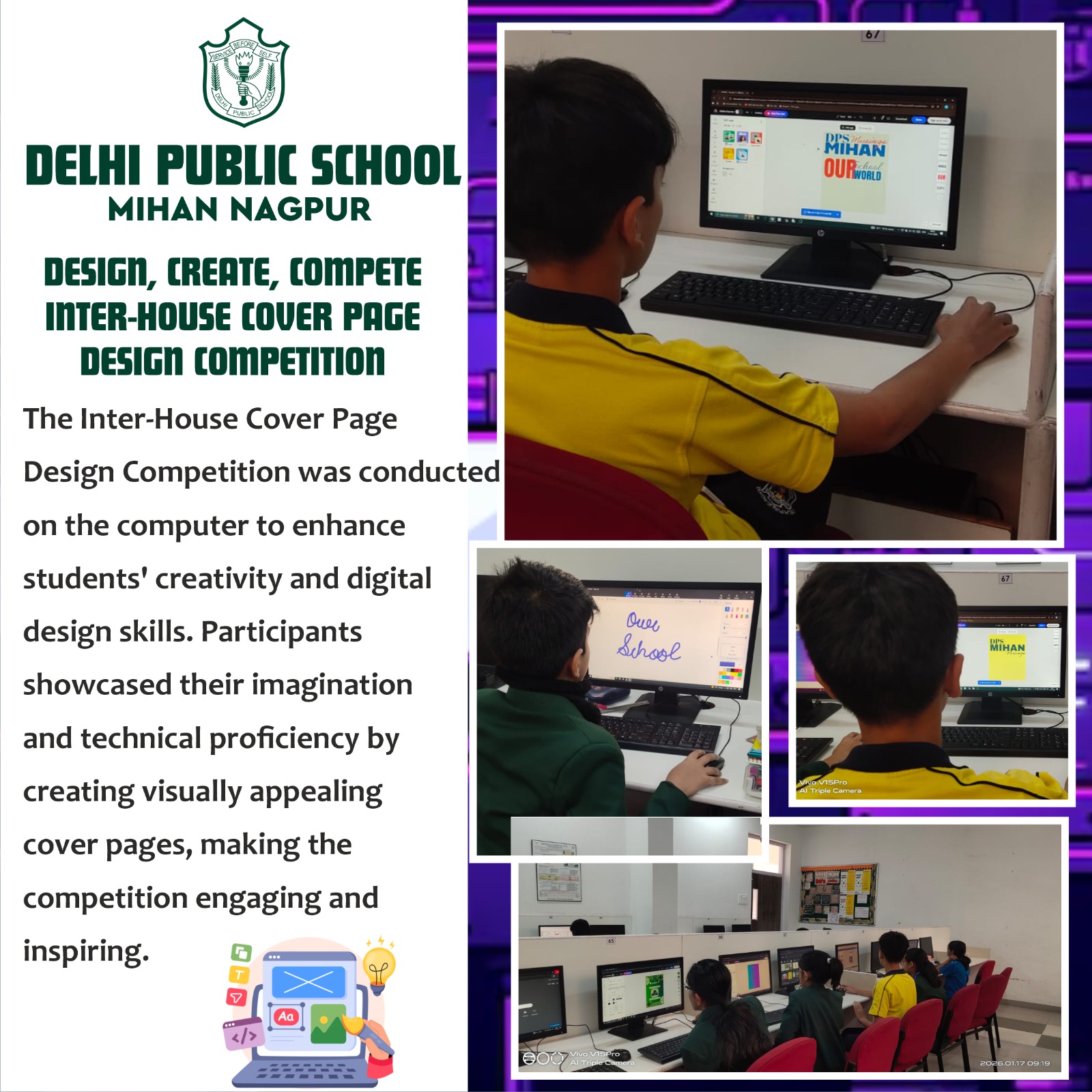 The Inter-House Cover Page Design Competition was conducted on the computer to enhance students’ creativity and digital design skills. Participants showcased their imagination and technical proficiency by creating visually appealing cover pages, making the competition engaging and inspiring.