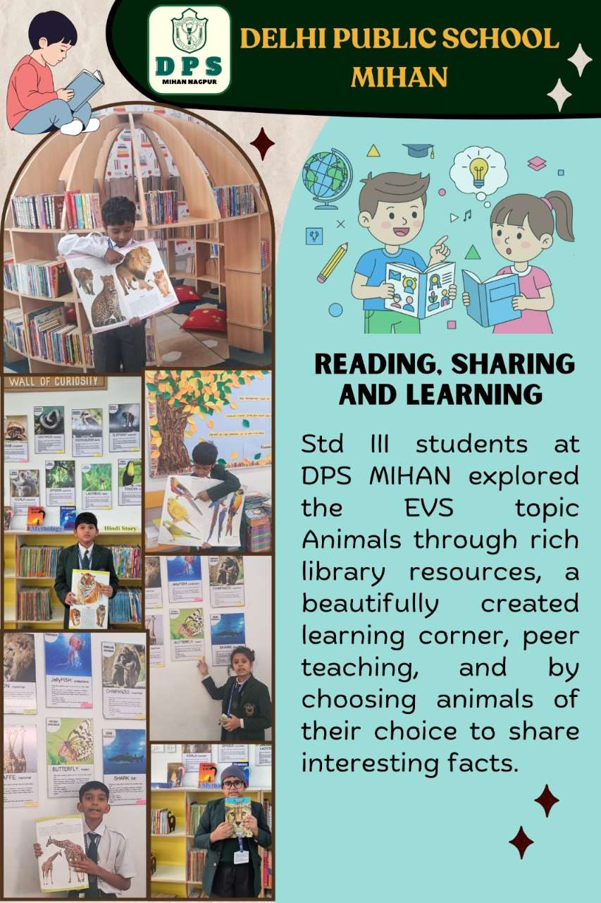 Std III students at DPS MIHAN explored the EVS topic Animals through rich library resources, a beautifully created learning corner, peer teaching, and by choosing animals of their choice to share interesting facts.