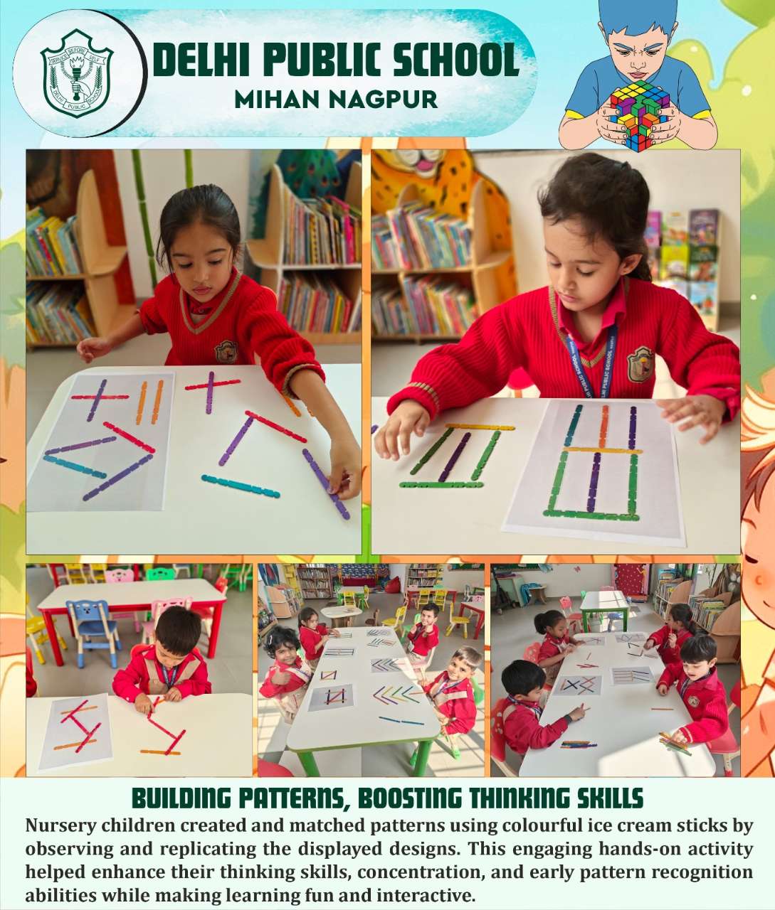 Nursery children created and matched patterns using colourful ice cream sticks by observing and replicating the displayed designs. This engaging hands-on activity helped enhance their thinking skills, concentration, and abilities while making learning fun and interactive.