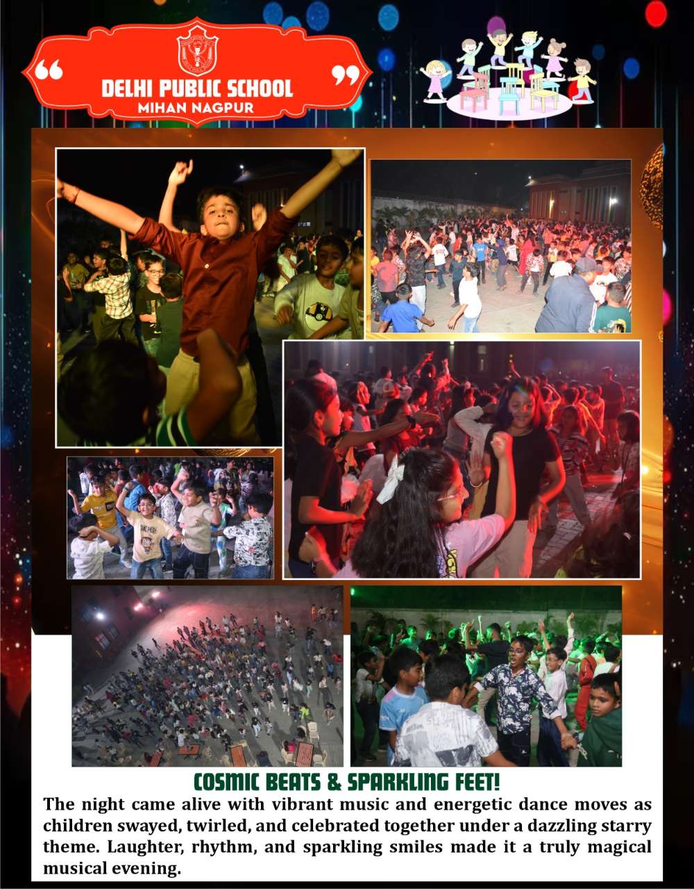 The night came alive with vibrant music and energetic dance moves as children swayed, twirled, and celebrated together under a dazzling starry theme. Laughter, rhythm, and sparkling smiles made it a truly magical musical evening.