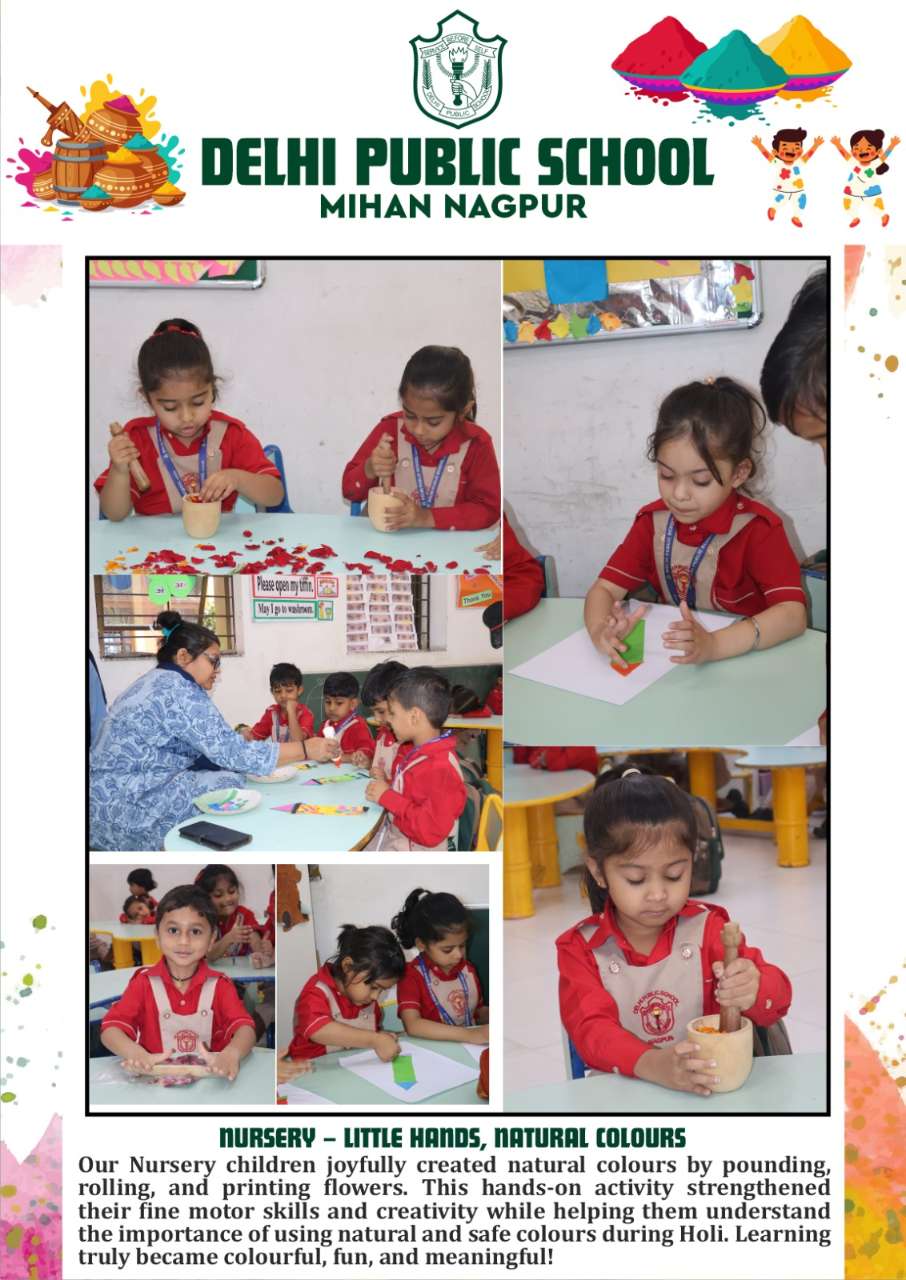 Our Nursery children joyfully created natural colours by pounding, rolling, and printing flowers. This hands-on activity strengthened their fine motor skills and creativity while helping them understand the importance of using natural and safe colours during Holi. Learning truly became colourful, fun, and meaningful!