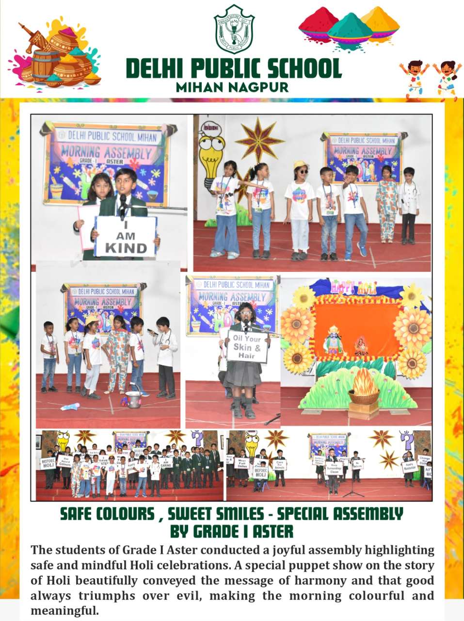 The students of Grade I Aster conducted a joyful assembly highlighting safe and mindful Holi celebrations. A special puppet show on the story of Holi beautifully conveyed the message of harmony and that good always triumphs over evil, making the morning colourful and meaningful.