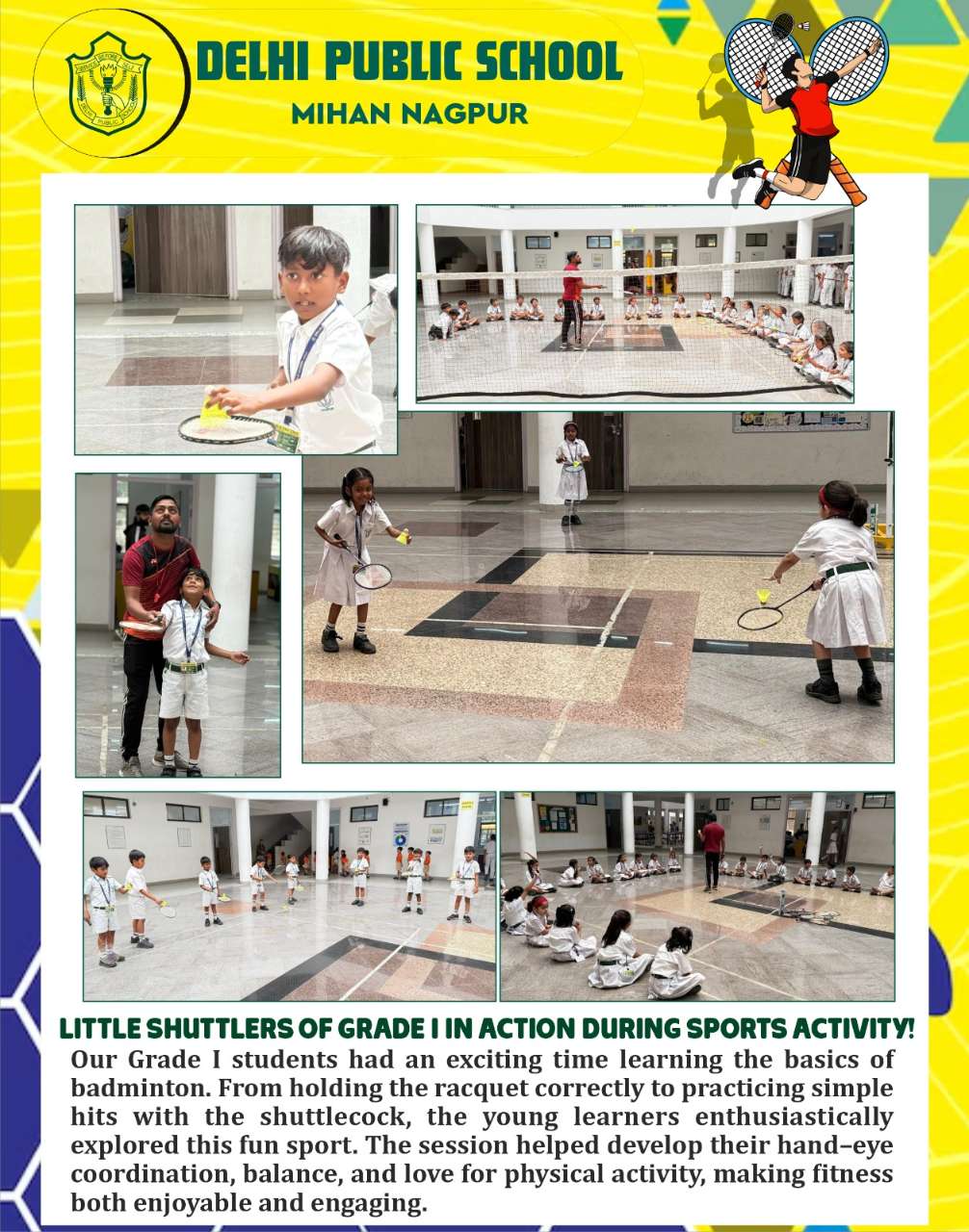 Our Grade I students had an exciting time learning the basics of badminton. From holding the racquet correctly to practicing simple hits with the shuttlecock, the young learners enthusiastically explored this fun sport. The session helped develop their hand–eye coordination, balance, and love for physical activity, making fitness both enjoyable and engaging.