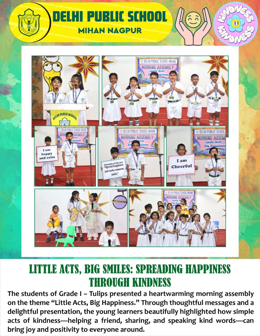 The students of Grade I – Tulips presented a heartwarming morning assembly on the theme “Little Acts, Big Happiness.” Through thoughtful messages and a delightful presentation, the young learners beautifully highlighted how simple acts of kindness—helping a friend, sharing, and speaking kind words—can bring joy and positivity to everyone around.