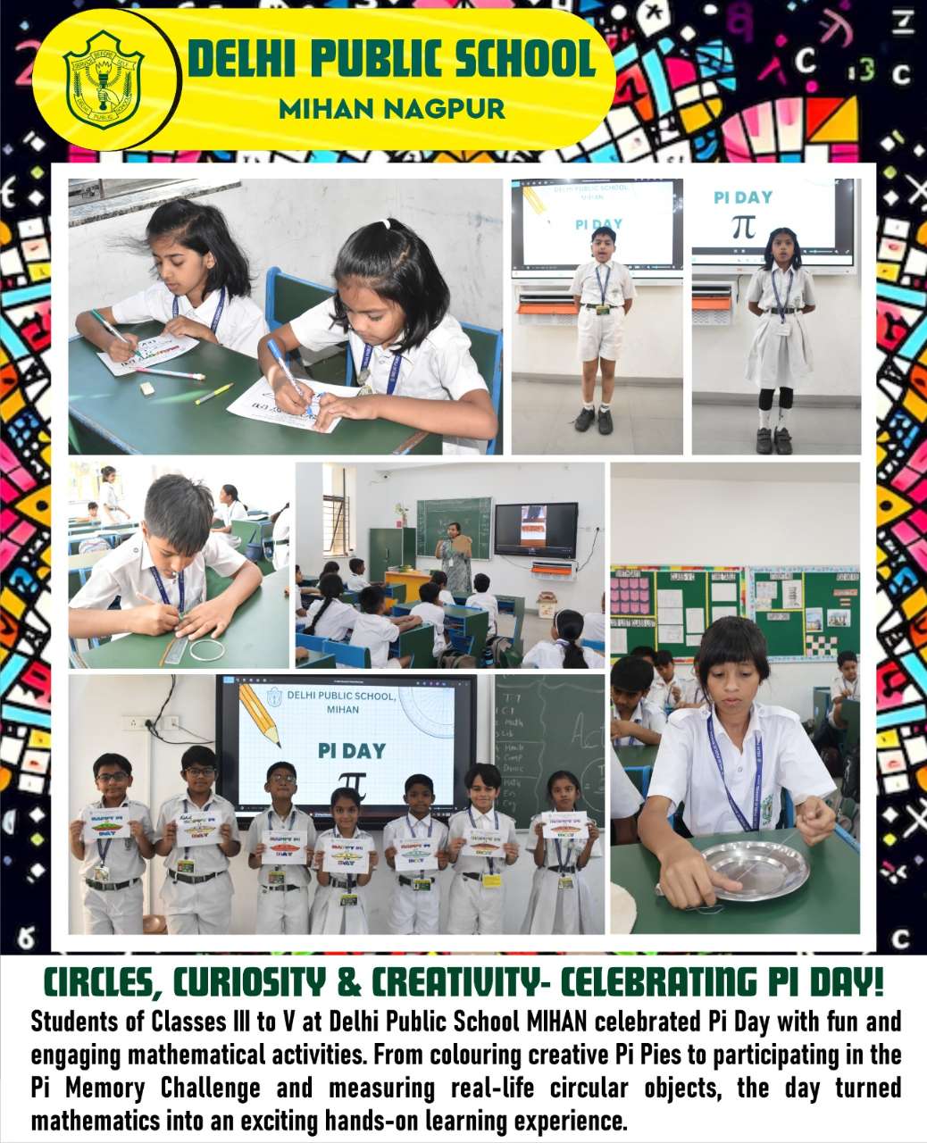Students of Classes III to V at Delhi Public School MIHAN celebrated Pi Day with fun and engaging mathematical activities. From colouring creative Pi Pies to participating in the Pi Memory Challenge and measuring real-life circular objects, the day turned mathematics into an exciting hands-on learning experience.