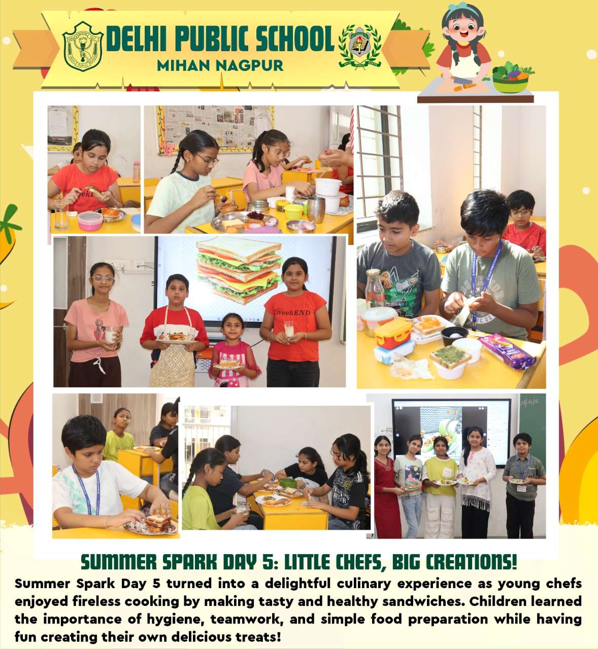 Summer Spark Day 5 turned into a delightful culinary experience as young chefs enjoyed fireless cooking by making tasty and healthy sandwiches. Children learned the importance of hygiene, teamwork, and simple food preparation while having fun creating their own delicious treats!